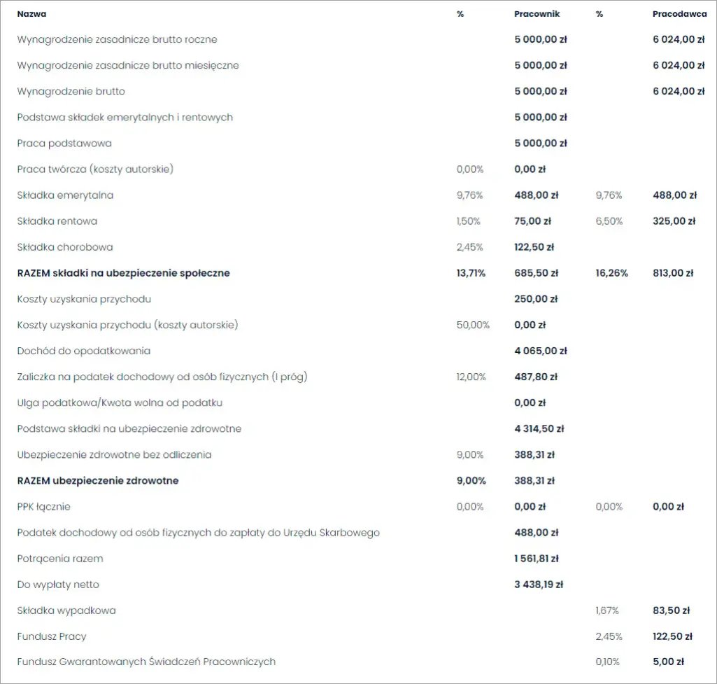 *Składka wypadkowa wynosi od 0,67% do 3,33% w zależności od m.in. grupy działalności i kategorii ryzyka, do której należy przedsiębiorca. Na potrzeby obliczeń przyjęliśmy stawkę 1,67%.